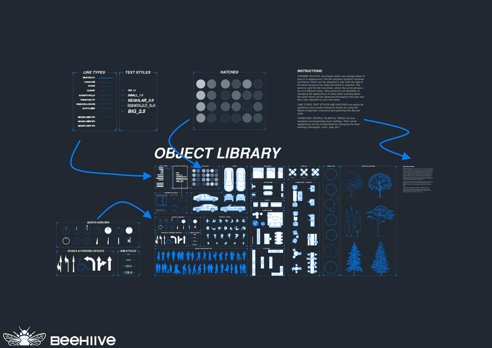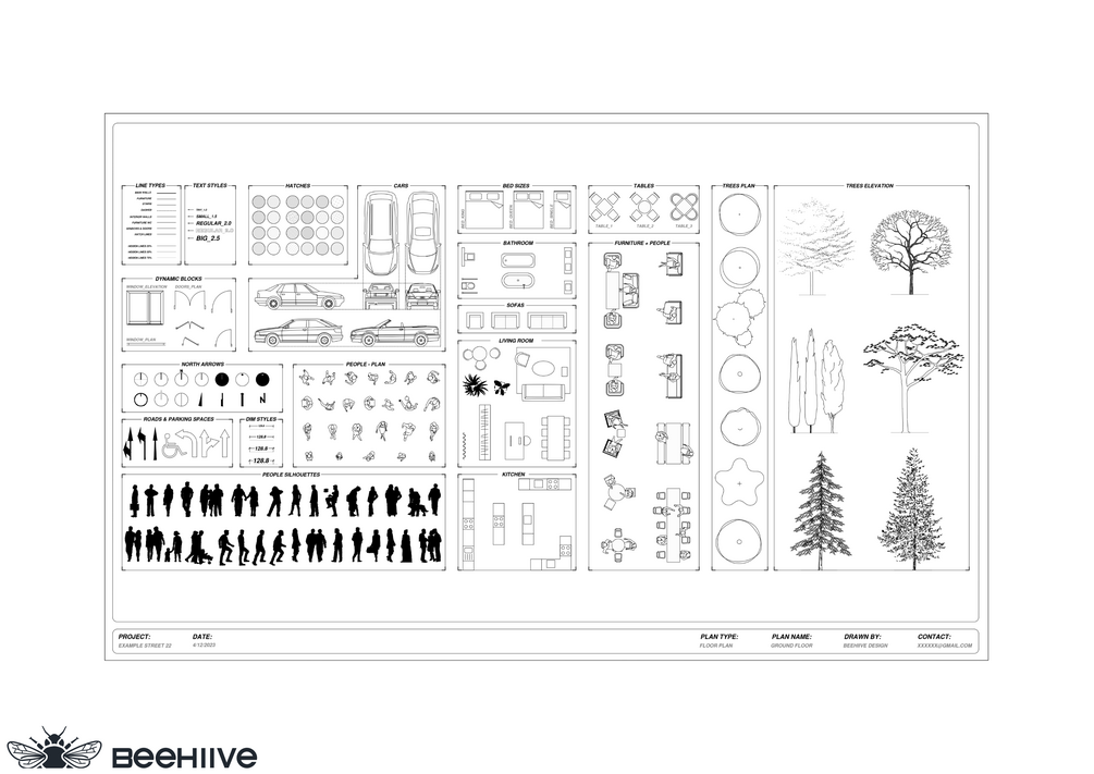 A carefully curated collection of furniture blocks, trees, text styles, grids, line types, hatches, layouts + an exemplary plan to showcase them.
